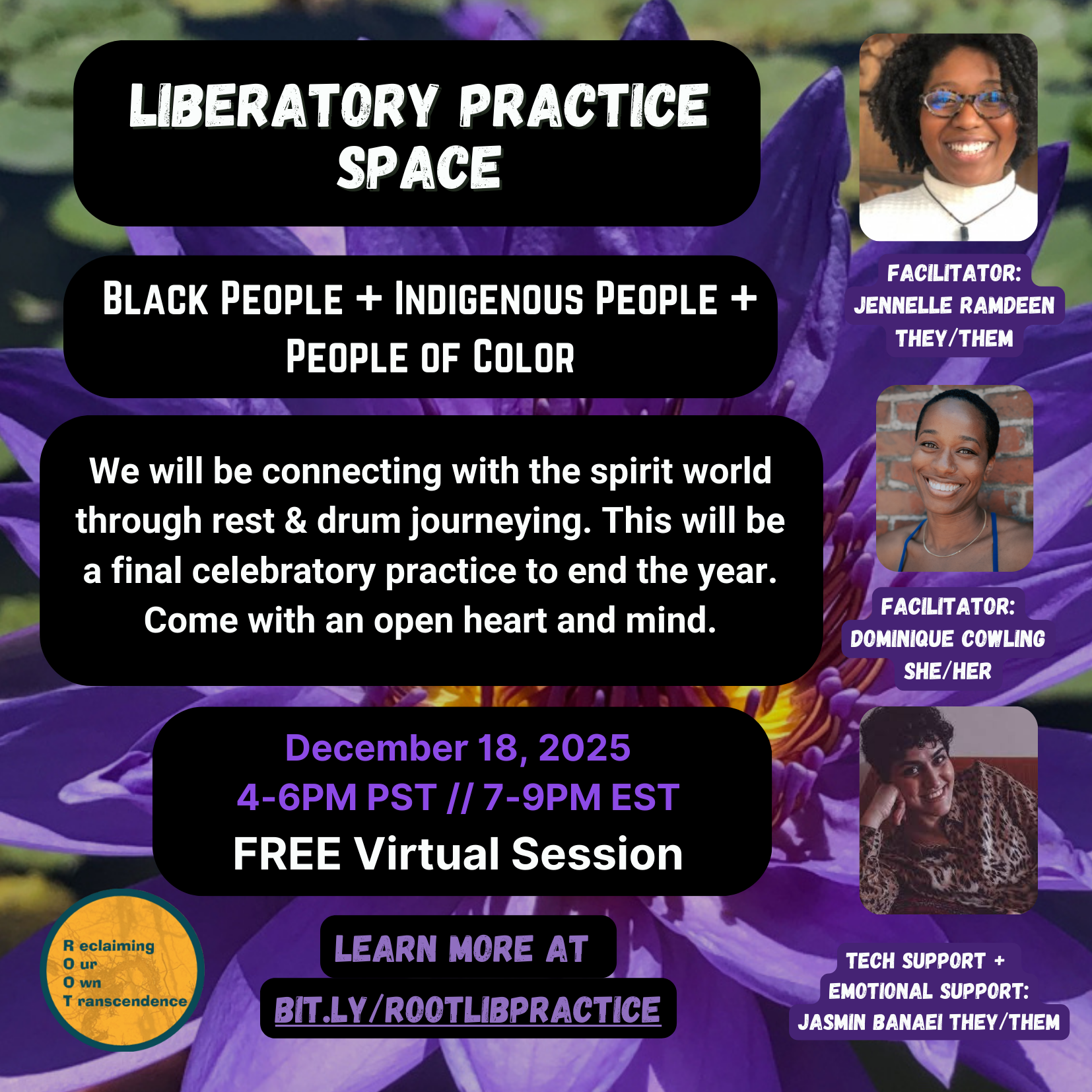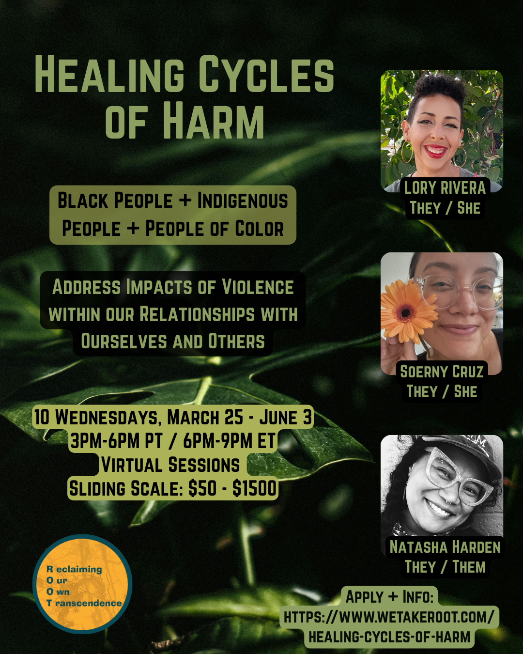 These drop-in, check-ins for BIPOC alumni of Healing Cycles of Harm provide an open container for folks who want to share what feels alive in your practice. The space will be open to sharing challenges, milestones, griefs, or anything else related to your growth and healing practice. We will meet every other week and facilitators will rotate among our tender and wise space holders depicted below.