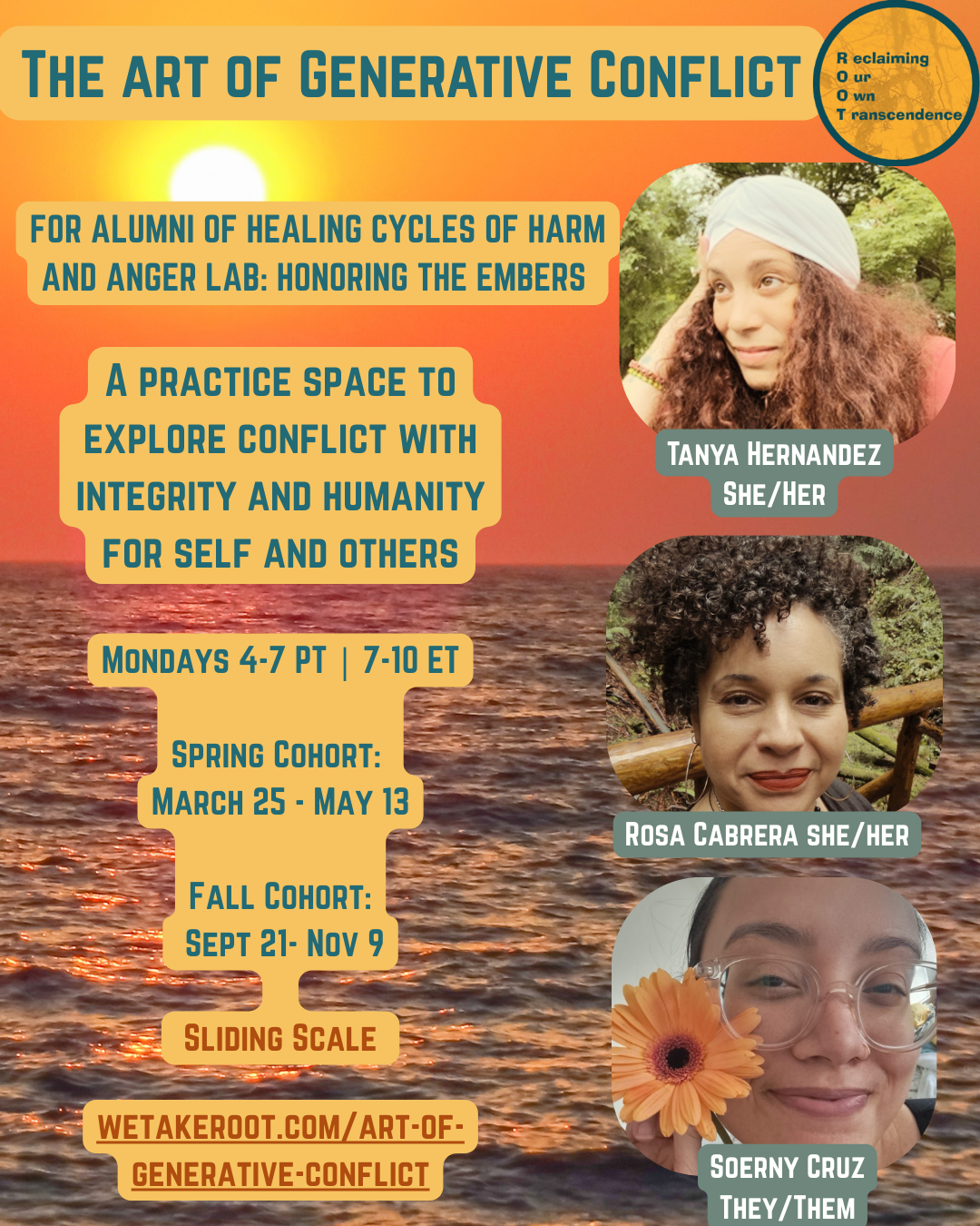 This is an emergent, practice space to explore how conflict is a site of personal and relational growth. We’ll examine what inner wisdoms or guides exist within us that can help us access discernment and make brave, values aligned choices during conflict. We’ll deepen our relationship with uncertainty and explore what it’s like to practice presence and navigate connection in emergent and creative contexts.