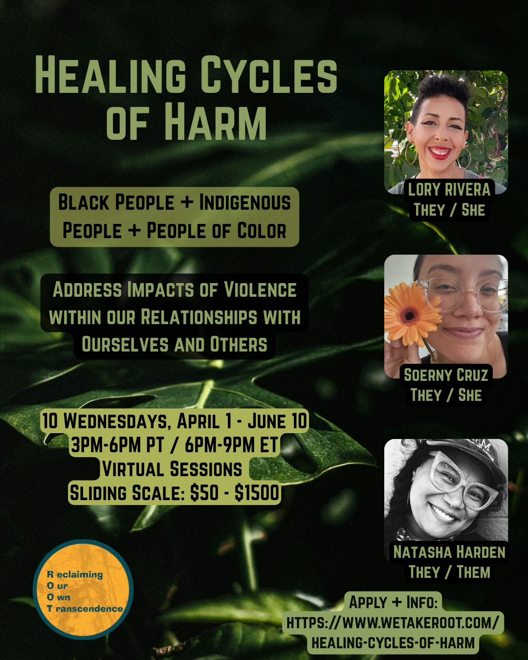 These drop-in, check-ins for BIPOC alumni of Healing Cycles of Harm and Anger Lab provide an open container for folks who want to share what feels alive in your practice. The space will be open to sharing challenges, milestones, griefs, or anything else related to your growth and healing practice. We will meet every other week and facilitators will rotate among our tender and wise space holders depicted below.