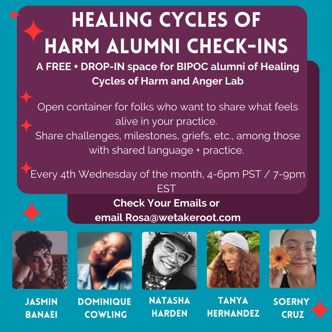 If you are a Healing Cycles of Harm alum, you should have received an email with more information about how to access our check-ins. If we no longer have a live email from you, please reach out to Rosa at rosa@wetakeroot.com